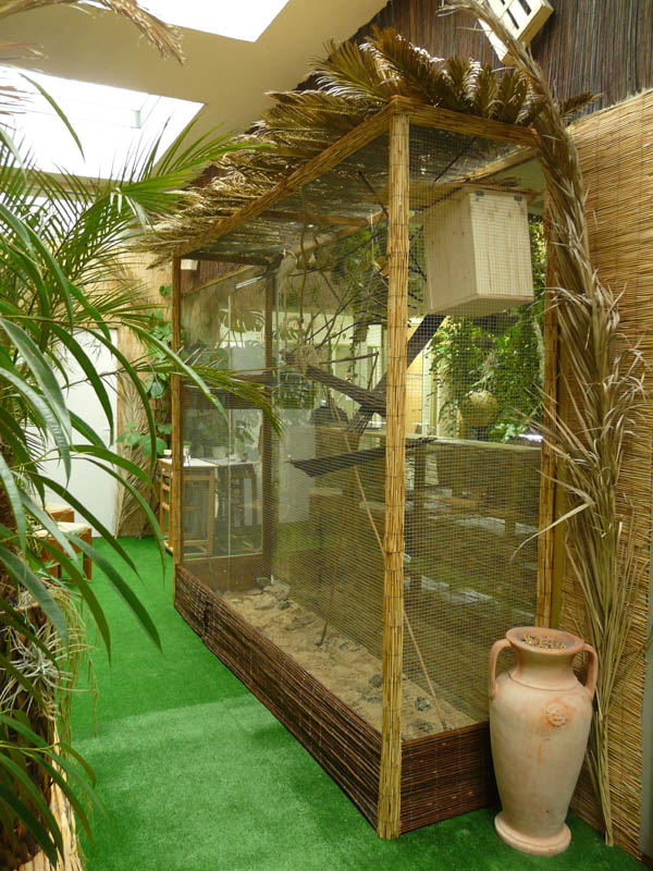 Je leur avais fabriqué précédemment une petite solution provisoire pour les occuper : un portique en osier, raphia et paille, que j’avais accroché en hauteur. Cette petite construction a tenu un mois avant de s’effondrer sous les assauts des pinces coupantes ailées. Elles ont mis une semaine avant de se l’approprier mais une fois ceci fait, elles ont adoré. Je retrouvais des cacas et des copeaux de bois partout au sol. Il était temps que cela cesse.