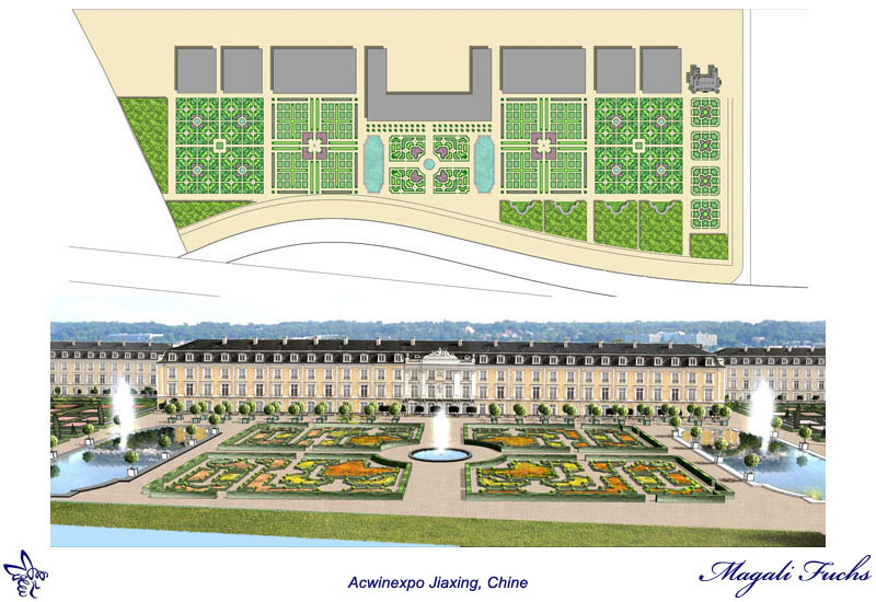 Esquisse pour la réalisation d'un jardin d'inspiration à la Française. Labyrinthes, massifs ornementaux, bordures de dentelles, bassins miroirs, orangeraie, encelades...