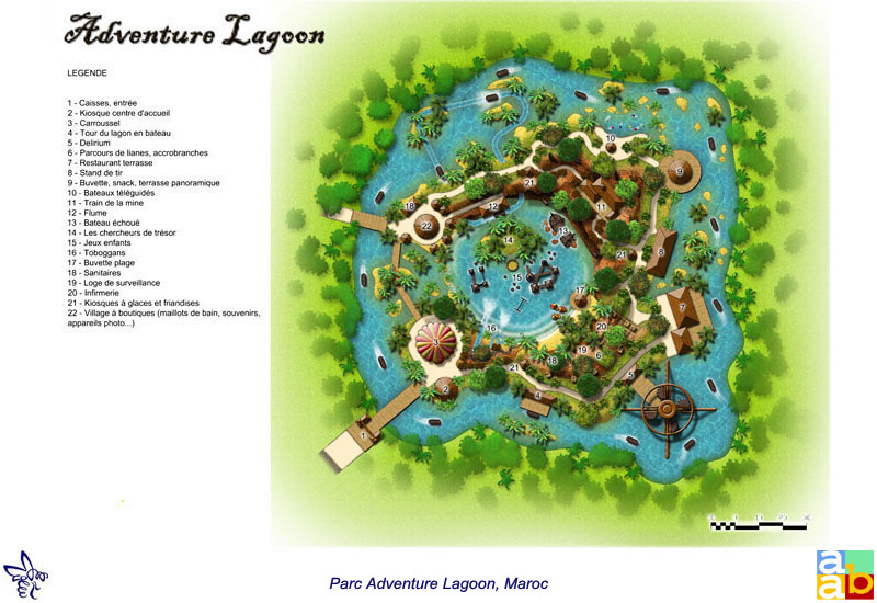 Esquisse : Conception d'un parc de loisirs sur le thème du lagon tropical et de la piraterie. Définition du programme des attractions, des espaces paysagés, des infrastructures aquatiques et des décors.