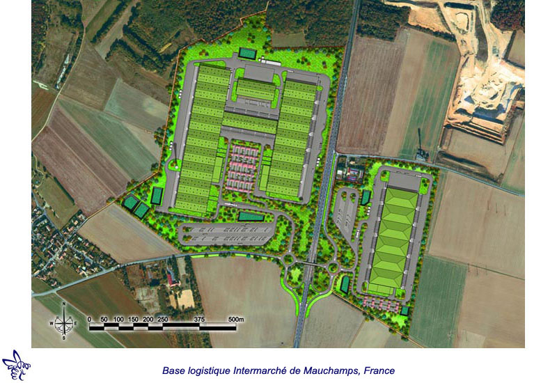 Volet paysager pour l'implantation d'une base Intermarché. Analyse de l'intégration du site dans le paysage, relevé de la flore locale, plantation d'arbres de bosquets et d'alignements, de haies bocagères et de noues, plan de terrassement.