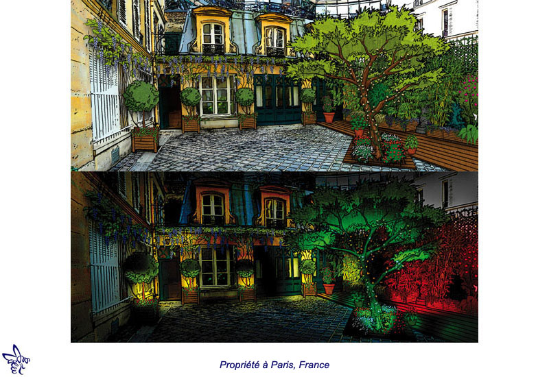 Conception d'une terrasse en cour sur dalle, topiaires en bacs, poteries, platelage bois, grimpantes et projet d'éclairage scénographique.