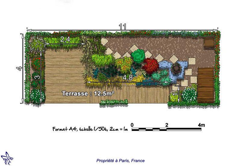 Conception d'une terrasse, de son jardinet et d'un petit potager dans un vieux jardin désaffecté du 14è.