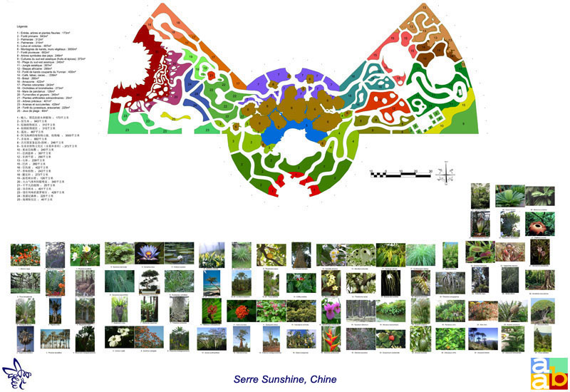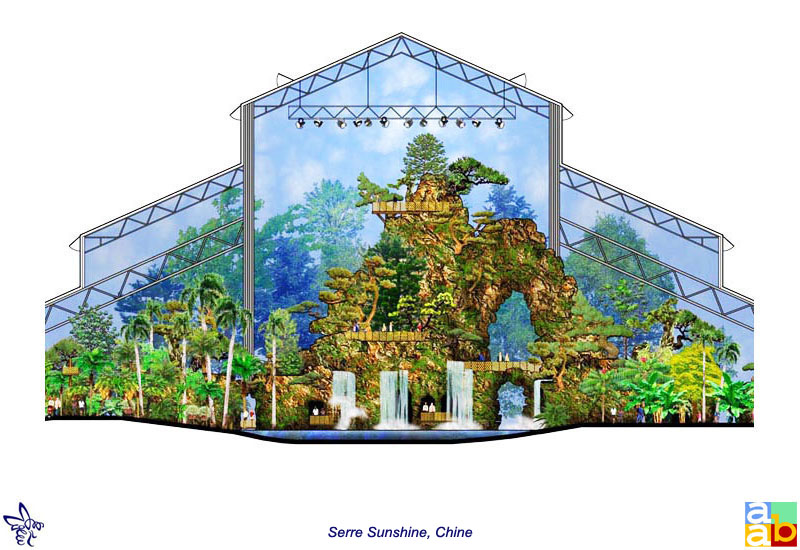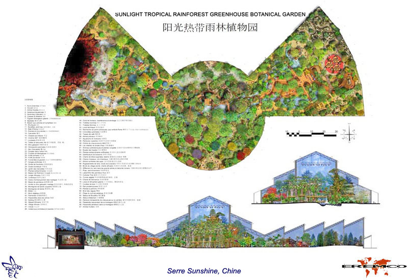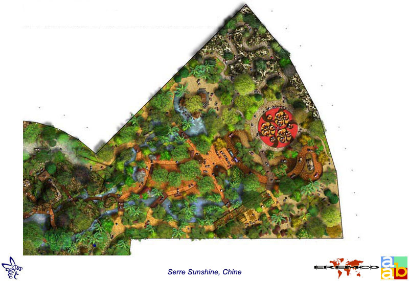 Maîtrise d'oeuvre conception. Esquisse, APS et APD. Serre tropicale ludique sur le thème de la préservation écologique des espèces. Conception des chemins, des décors, d'un réseau aquatique de bassins, cascades et rivières, intégration des animations, manèges et attractions, définition d'une palette d'espèces végétales tropicales de chaque continent.